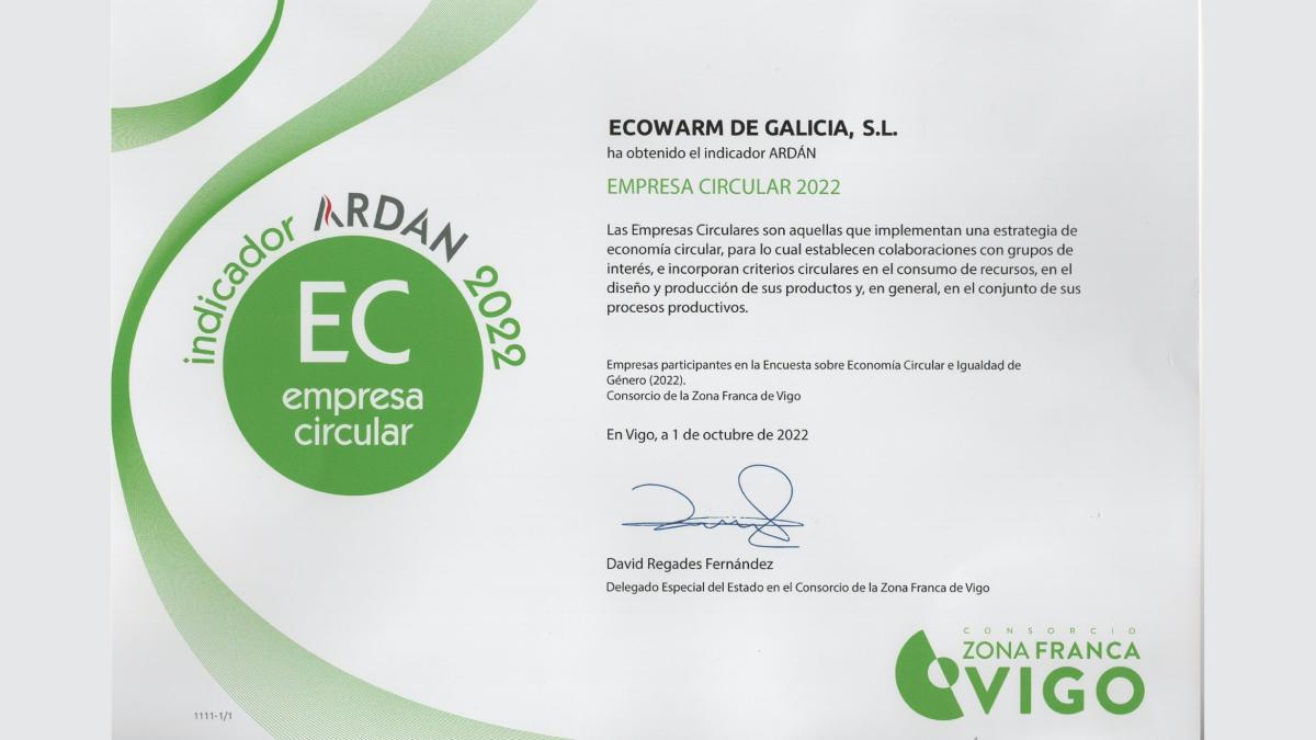 Our commitment to a sustainable business strategy has received new recognition. On this occasion, the Vigo Free Trade Zone Consortium has decided to grant Ecowarm the ARDAN 2022 – Circular Company indicator, an award for our efforts to move towards the most sustainable scenario possible in our company and sector.